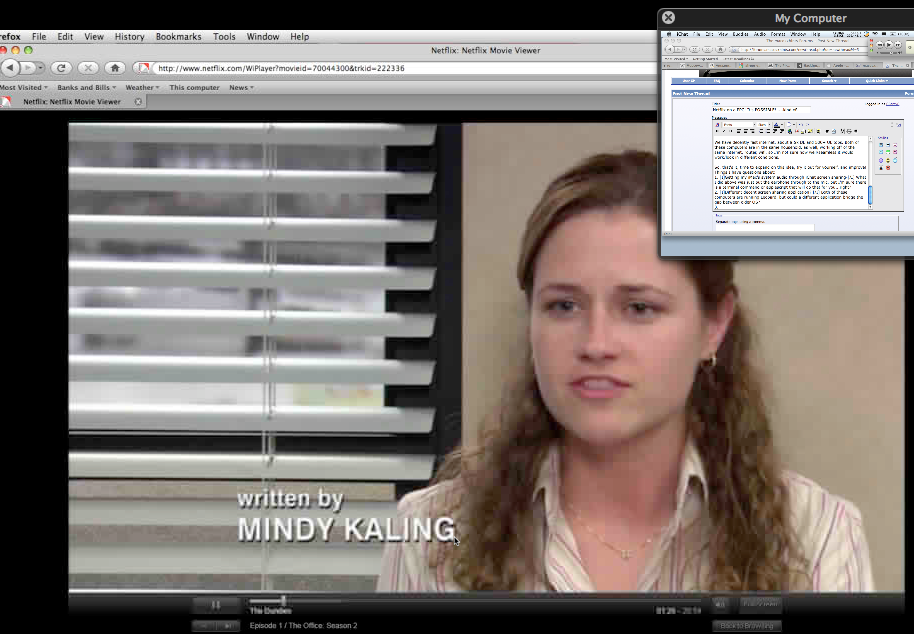 Being a subscriber to Netflix, I was super duper excited when they first released the PC streaming. Of course, I was then let down to realize that it was indeed PC streaming.. as in "Not Mac Compatible". For those with Intel Macs and a copy of Windows, they could watch fine via Bootcamp, etc. Finally, the dream was brought to those with Intel Macs, (without Windows) via Silverlight. Those with PowerPCs are still left in the dark. BUT! What I have done recently is a simple quick way to watch my Netflix Instant movies in a half decent quality. Unfortunately, you need an Intel Mac anyway, and the only reason I can think of that you'd want to do this is if you had a desktop Mac, but wanted to watch your instant movies on the couch or in bed, somewhere on your PPC laptop (this now actually makes me think it might apply to all those people still toting around their trusty PowerBooks, but..yeah) My subjects: iMac, 2.4GHz, 10.5.6, 4GB RAM. Intel. iBook G4, 1.33GHz, 10.5.2, 1 GB RAM. PowerPC (duh) Now, to my simple explanation. Using iChat on my iMac, I share my screen with my iBook G4. Navigate to the Netflix site, select what you want to watch instantly, (I like to go to fullscreen). I can now get the video portion of my instant Netflix! Now, to get the audio, I put a double ended 3.5mm audio cord (headphones) into the headphone jack and and microphone jack, and change the audio in my iChat preferences from microphone to line in. This now routes the audio from the iMac through to the iBook. I now have both audio and video, and decent quality, on my PowerPC iBook. We have decently fast internet, about 8.5k DL and 500+ UL tops. Both of these computers are in the same household, as well, working off of the same internet, router, wifi, so I'm not sure how well/seamless it would work/look in different conditions. Proof! ![]() So, that's it, time to expand on this idea, try it out for yourself, and improve! Things I have questions about: 1. Getting my iMac's system audio through iChat screen sharing- What I did above was just put the earphone through to the mic, but I'm sure there is a terminal command or applescript that will do that for you...right? 2. Different decent screen sharing application? Both of these computers are running Leopard, but could a different application bridge the gap between older OS? 3. Compatibility with other PowerPC's (that's your queue to test) thanks for reading! |